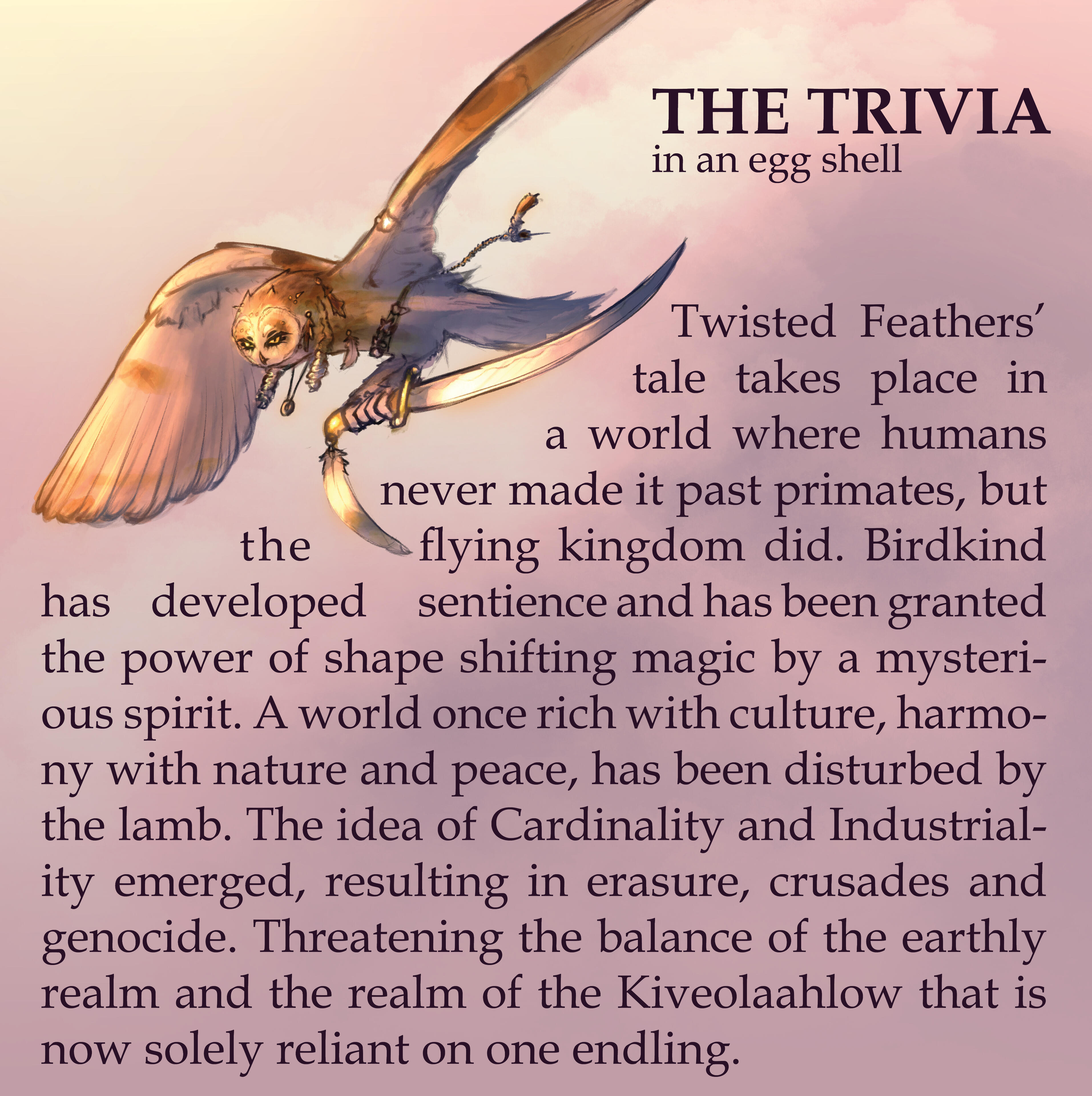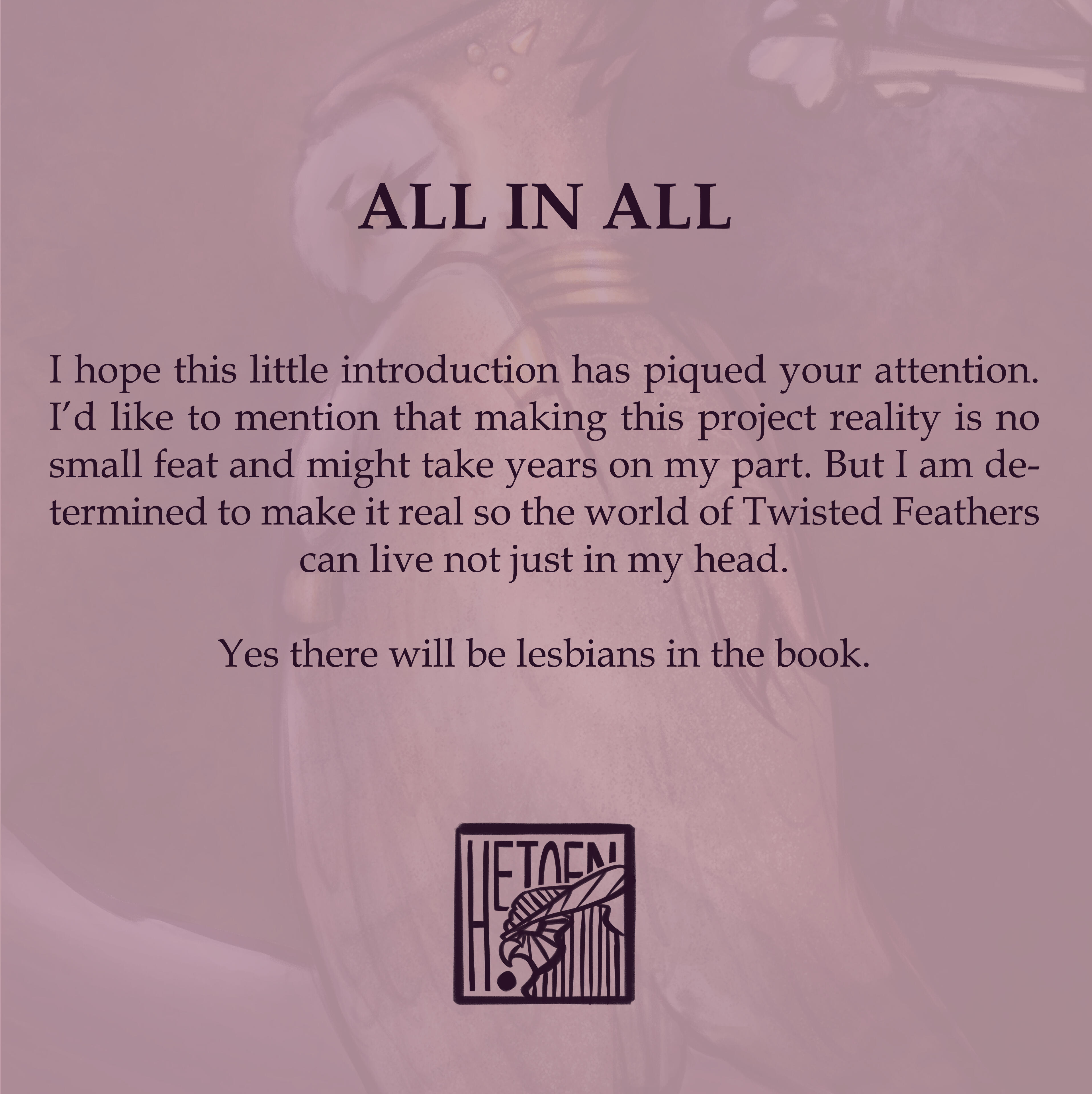 Welcome to the world of Twisted Feathers!This is a proof of concept and introduction to my passion project on which I’ve been working on.In the following months I will attempt to redo the first few chapters so you can get a glimpse of just what kind of story Twisted Feathers is.While I am not making promises, I will bring this world to life one way or another! Maybe the medium changes, maybe the plot changes. Everything can be changed!Also important to mention that this is not something I am doing full time! I am university and animation school student who does illustration for a questionable living. That means delays, delays, delays. Some things are just outside of my control.